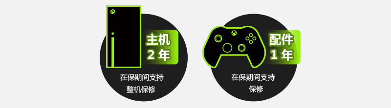 Xbox 主机2年保修,在保期间支持整机保修;配件1年保修,在保期间支持保修。